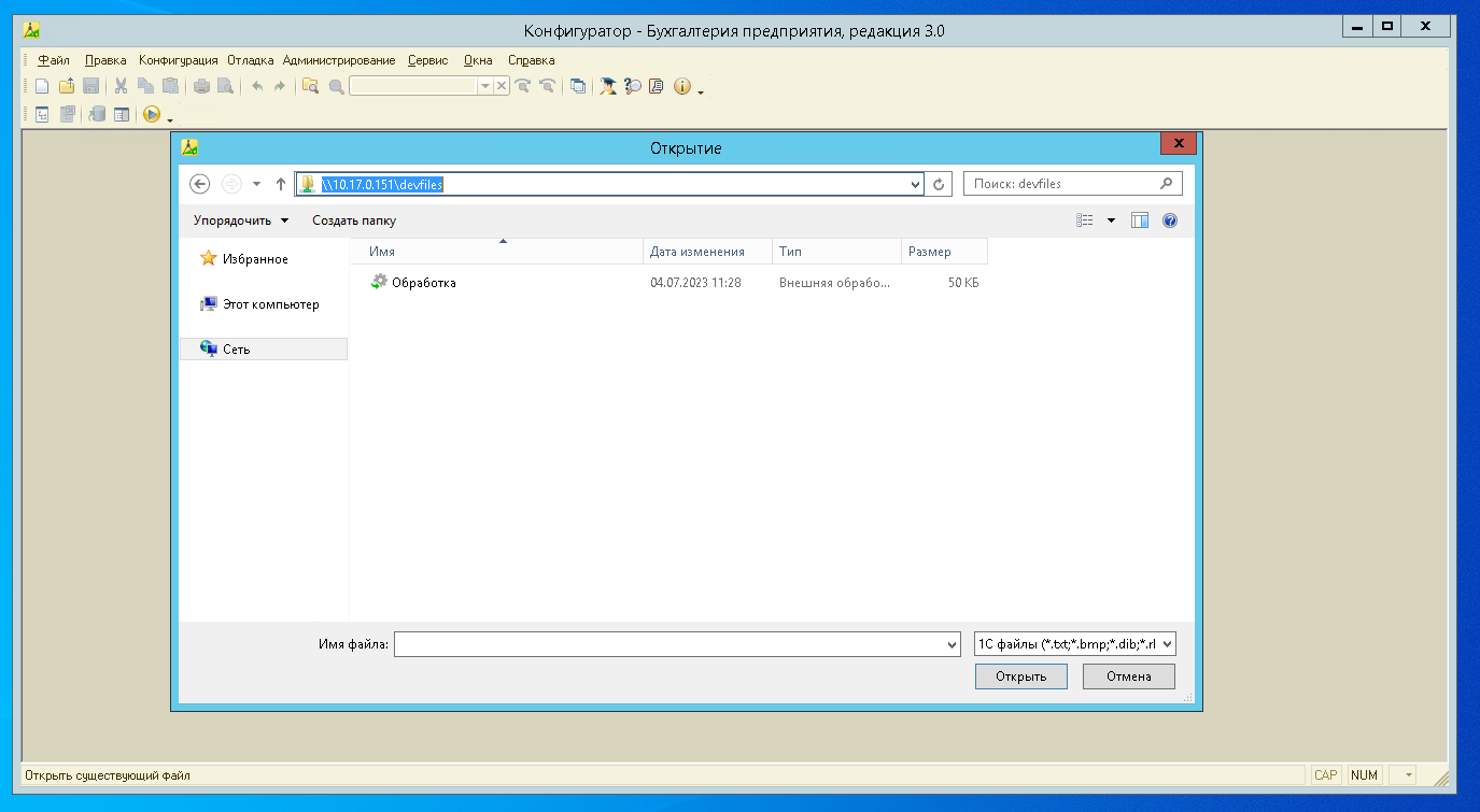 Теперь переданный файл может увидеть база. Откроем её в любом режиме, в этом примере мы используем конфигуратор: